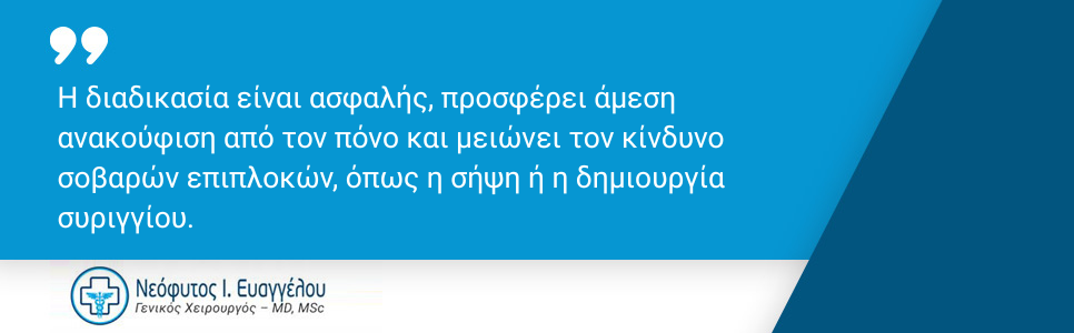 Η διάρκεια της επέμβασης είναι σύντομη, συνήθως 15–30 λεπτά, και ο ασθενής μπορεί να επιστρέψει στο σπίτι του την ίδια ή την επόμενη ημέρα. Μετά την επέμβαση, δίνονται οδηγίες για καθημερινό καθαρισμό της περιοχής, συχνές αλλαγές επιδέσμων και λήψη παυσίπονων εφόσον χρειαστεί. Σε ειδικές περιπτώσεις, χορηγούνται και αντιβιοτικά για την αποτροπή περαιτέρω μόλυνσης.